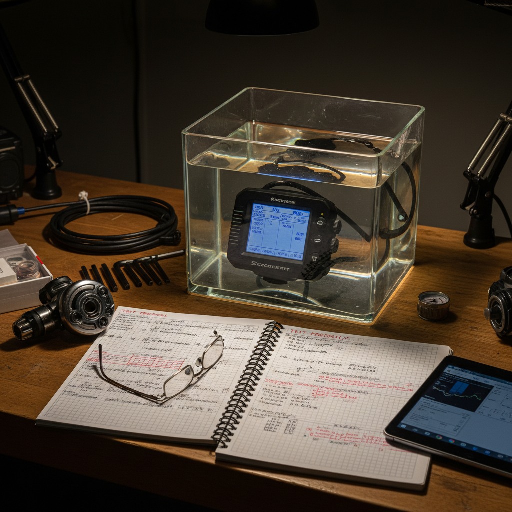 - Test komputera nurkowego: Włącz, sprawdź działanie przycisków i wyświetlacza.