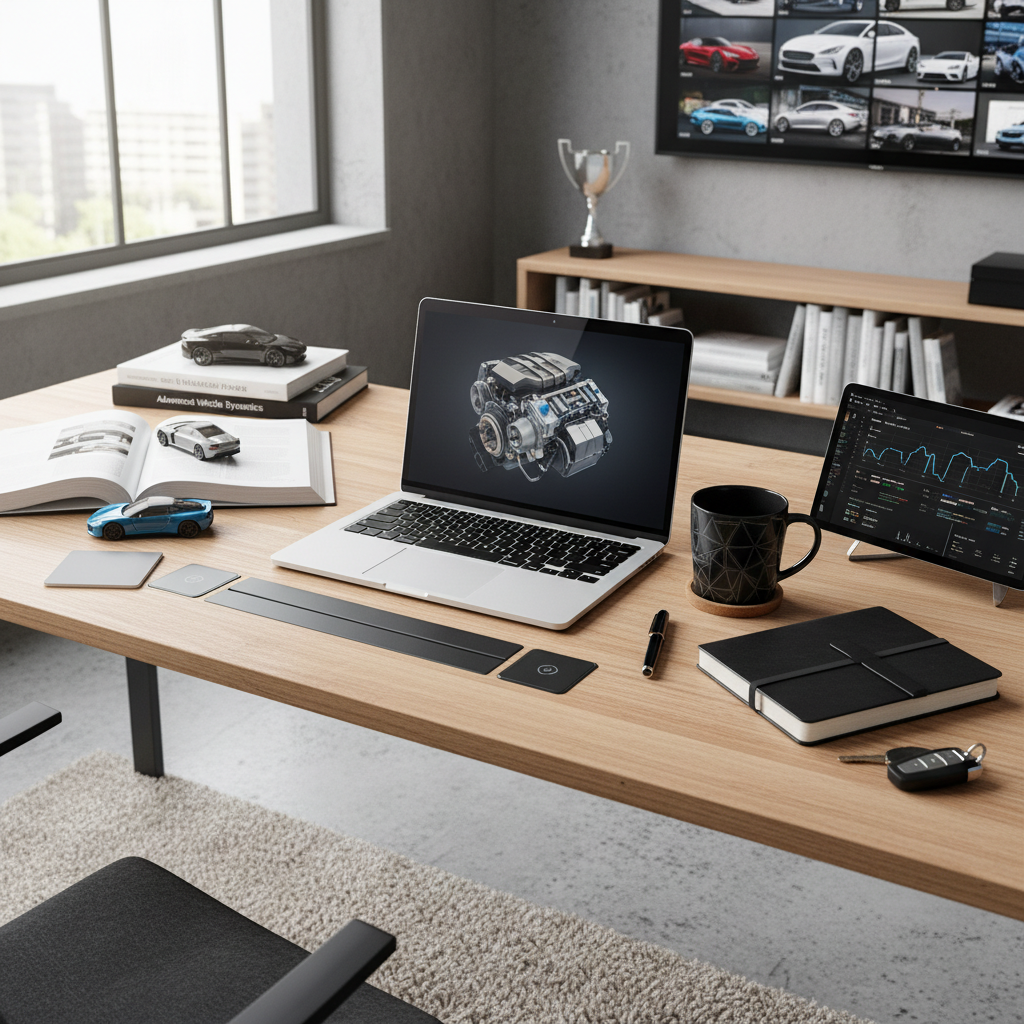 Zdjęcie przedstawia nowoczesne stanowisko pracy z laptopem, kluczykami od auta, kawą i notatnikiem wymieniającym sprawdzone narzędzia do sprzedaży samochodu.